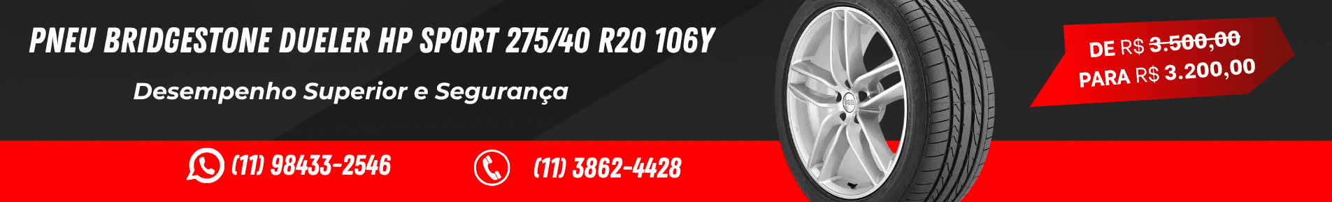 A Borracharia JK possui mais de 25 anos de experiência e sucesso no mercado, oferecendo serviços de alta qualidade e sempre priorizando a satisfação de nossos clientes. Trabalhamos com a revenda de pneus novos, vulcanização, pneus run flat e blindados, além de serviços como balanceamento e alinhamento. Entre nossos produtos, destacamos o Pneu Bridgestone Dueler HP Sport 275/40 R20 106Y. O Nosso compromisso é garantir o melhor desempenho e segurança para o seu veículo. Abrimos aos domingos e feriados. Entre em contato: (11) 98433-2546. Estamos localizados na Rua Carlos Vicari, 235, Água Branca – São Paulo/SP.