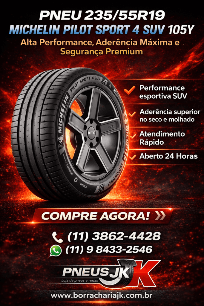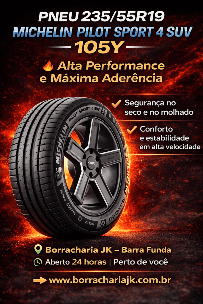 Se você está procurando pneu 235/55R19 Michelin Pilot Sport 4 SUV 105Y perto de mim, a Borracharia JK na Barra Funda é a escolha ideal. Trabalhamos com pneus Michelin originais, garantindo alta performance, máxima aderência e segurança premium para SUVs de alto padrão.