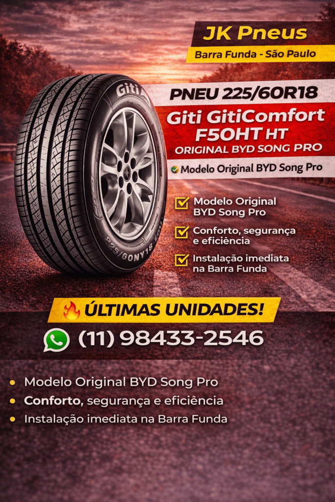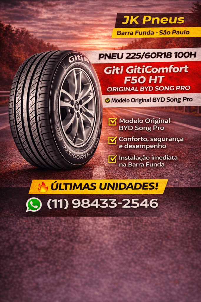 Na JK Pneus, você encontra o Pneu 225/60R18 100H Giti GitiComfort F50 HT Original BYD Song Pro com atendimento rápido, instalação especializada e confiança na hora da troca. Somos referência em pneus na Barra Funda, São Paulo, para quem procura loja de pneus perto de mim, pneu original BYD Song Pro em São Paulo e troca de pneus com agilidade.