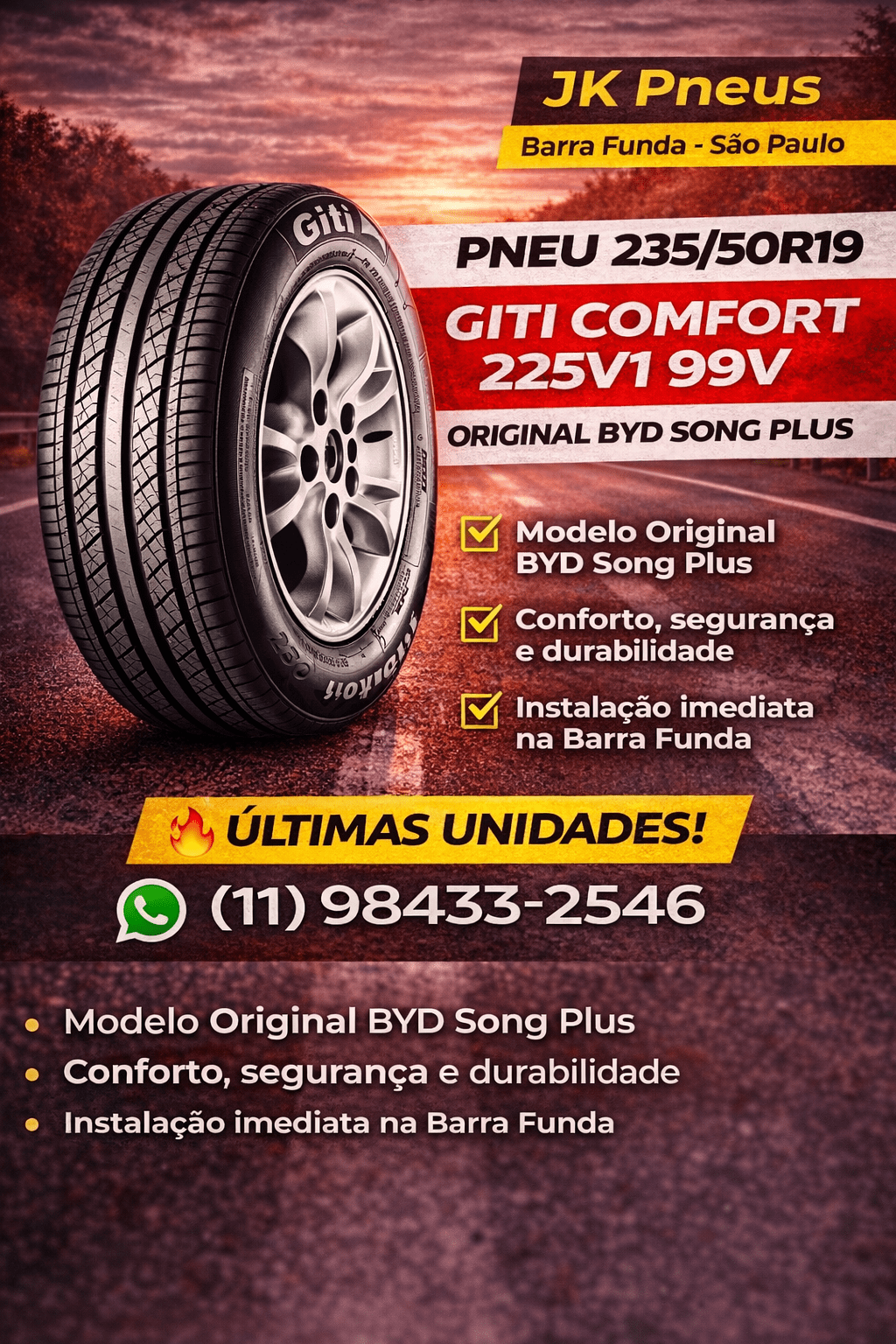Na JK Pneus, você encontra o Pneu 235/50R19 Giti Comfort 225V1 99V Original BYD Song Plus com atendimento rápido e instalação especializada. Somos referência em pneus na Barra Funda, São Paulo, para quem procura loja de pneus perto de mim, pneu original BYD Song Plus em São Paulo e troca de pneus com agilidade.