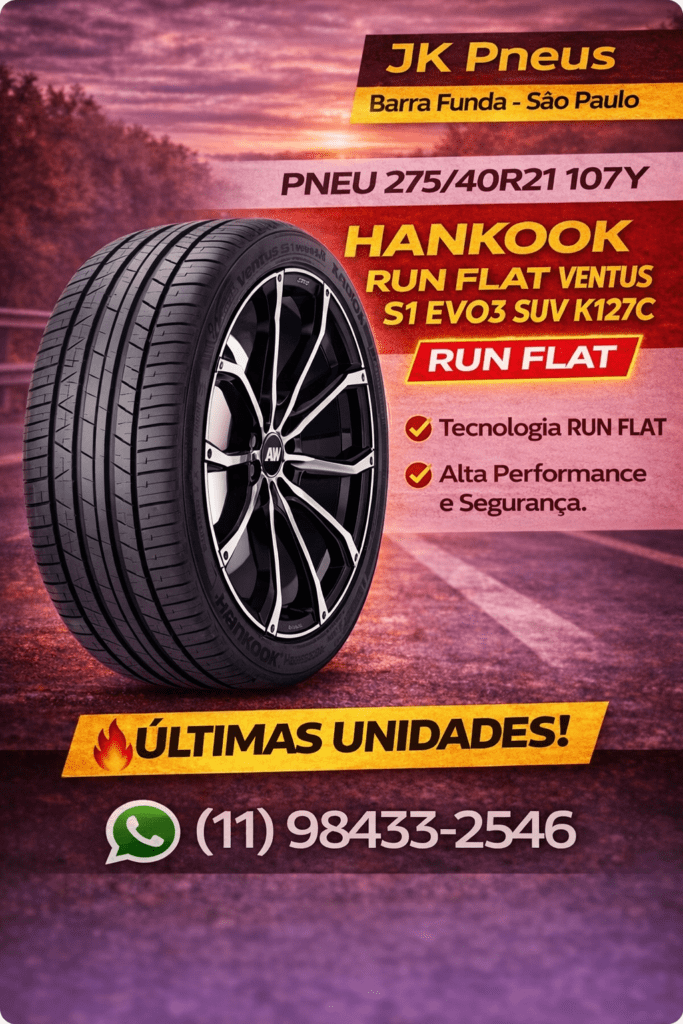 Na JK Pneus, você encontra o Pneu 275/40R21 Hankook Run Flat Ventus S1 Evo3 SUV K127C 107Y com atendimento rápido, instalação especializada e confiança na hora da troca. Somos referência em pneus na Barra Funda, São Paulo, para quem procura loja de pneus perto de mim, pneu Hankook Run Flat em São Paulo e troca de pneus com agilidade.