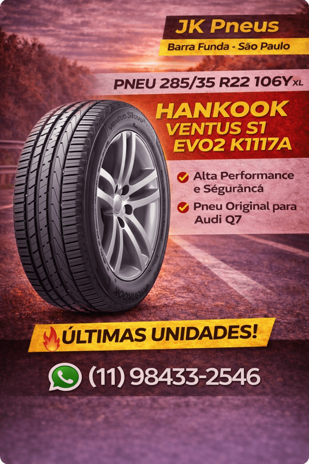 Na JK Pneus, você encontra o Pneu 285/35 R22 106Y XL Hankook Ventus S1 Evo2 K117A Original Q7 com atendimento rápido, instalação especializada e confiança na hora da troca. Somos referência em pneus na Barra Funda, São Paulo, para quem procura loja de pneus perto de mim, pneu Hankook em São Paulo e troca de pneus com agilidade.