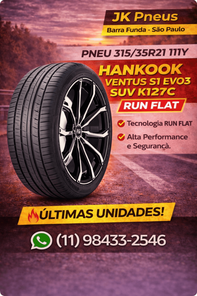 Na JK Pneus, você encontra o Pneu 315/35R21 Hankook Run Flat Ventus S1 Evo3 SUV K127C 111Y com atendimento rápido, instalação especializada e confiança na hora da troca. Somos referência em pneus na Barra Funda, São Paulo, para quem procura loja de pneus perto de mim, pneu Hankook Run Flat em São Paulo e troca de pneus com agilidade.
