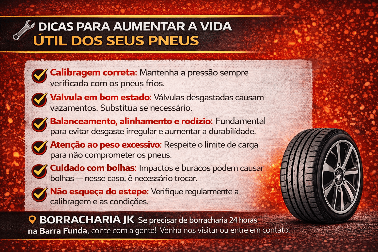 Bolhas: Geralmente ocorrem por buracos ou más condições da pista, e precisa ser substituído quando apresenta este problema. Estepe: Não se esquecer de checar o estepe, conferindo sua calibragem e estado de conservação Aproveite agora mesmo e venha nos conhecer! Se você procura por borracharia 24 horas Barra Funda, estamos localizados na região. Entre em contato conosco, tire suas dúvidas, e traga o seu veículo na BORRACHARIA JK.