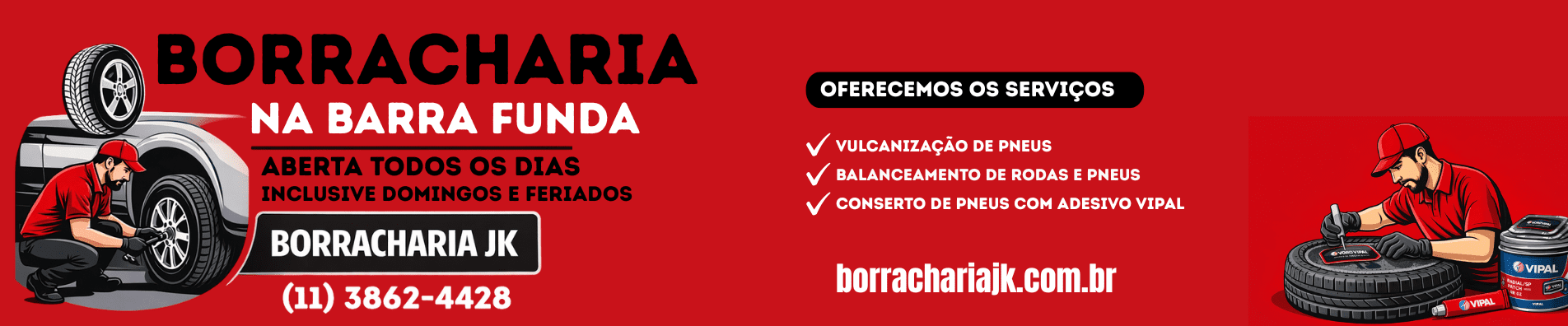 Caso o seu pneu apresente algum dos problemas acima, não pense duas vezes: Vá ao borracheiro que estiver disponível para resolver o problema o quanto antes. Na BORRACHARIA JK abrimos aos finais de semana e feriados, permitindo a você realizar a manutenção a qualquer dia que você estiver disponível.